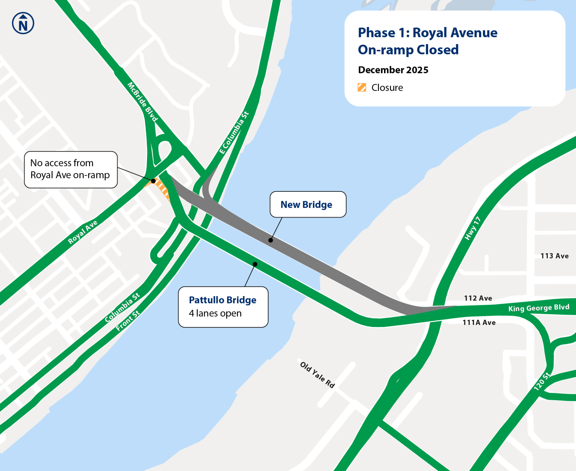 The new Royal Avenue on-ramp and new Columbia Street loop-ramp will open in phases as they cannot be completed until sections of the connecting roadways and the Pattullo Bridge have been removed. Learn more about construction activities in New Westminster after bridge opening