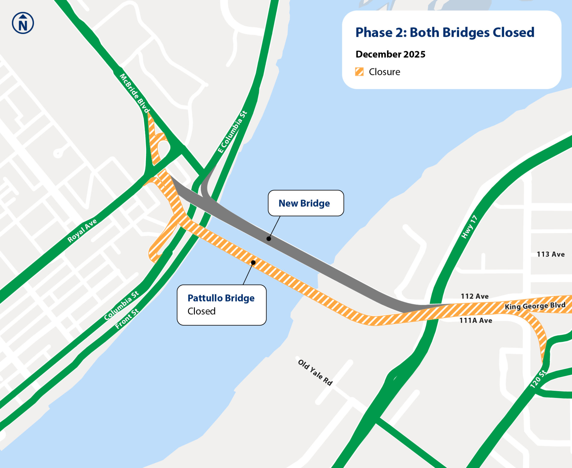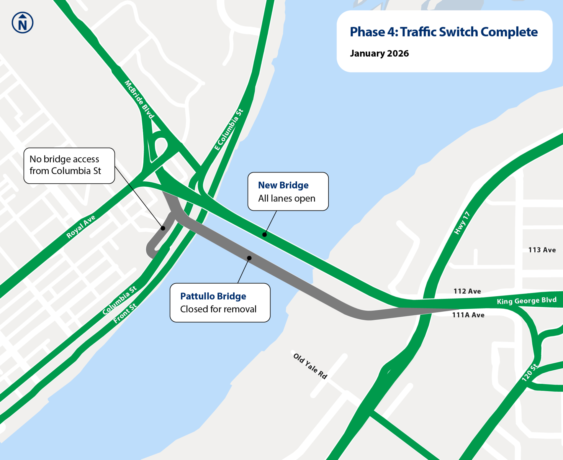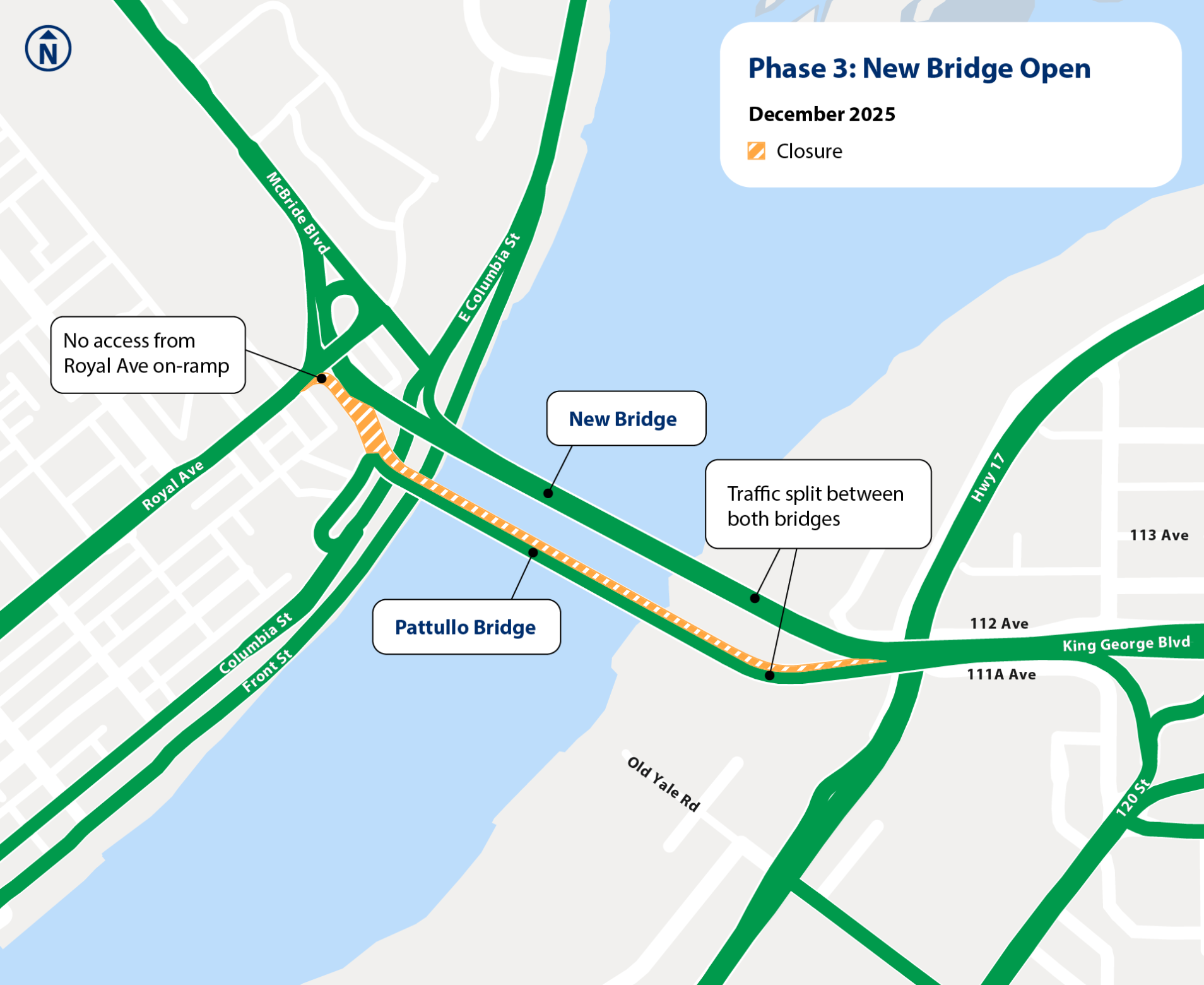 The new bridge is scheduled to open by Christmas 2025. On opening day, it will connect to King George Boulevard in Surrey and McBride Boulevard in New Westminster. The off-ramp to East Columbia Street in New Westminster will also be open.