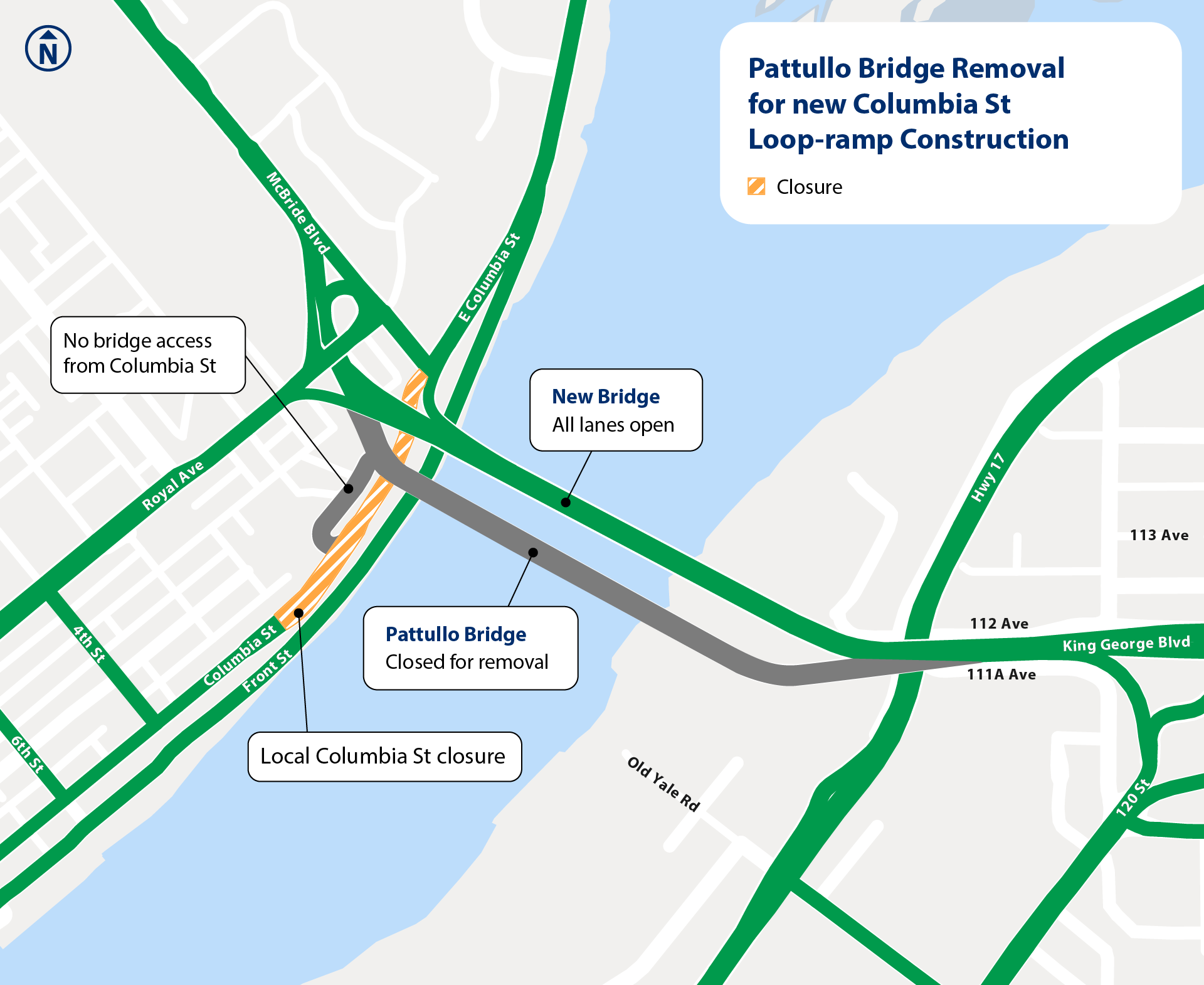 A local closure of Columbia Street between McBride Boulevard and Elliot Street, for approximately one month, will be required to deconstruct the Pattullo Bridge and build the new Columbia loop-ramp (see local closure map).