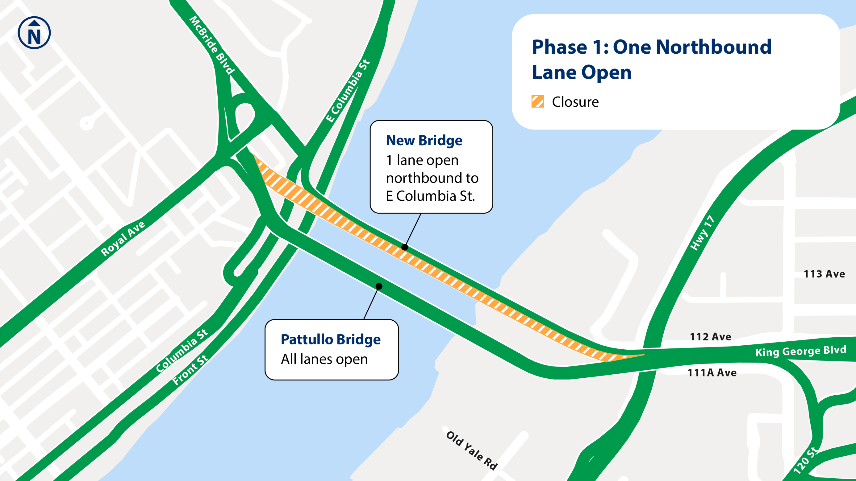The new Royal Avenue on-ramp, Columbia Street loop-ramp and Highway 17 off-ramp will open in phases, as they cannot be completed until sections of the connecting roadways and the Pattullo Bridge have been removed.
