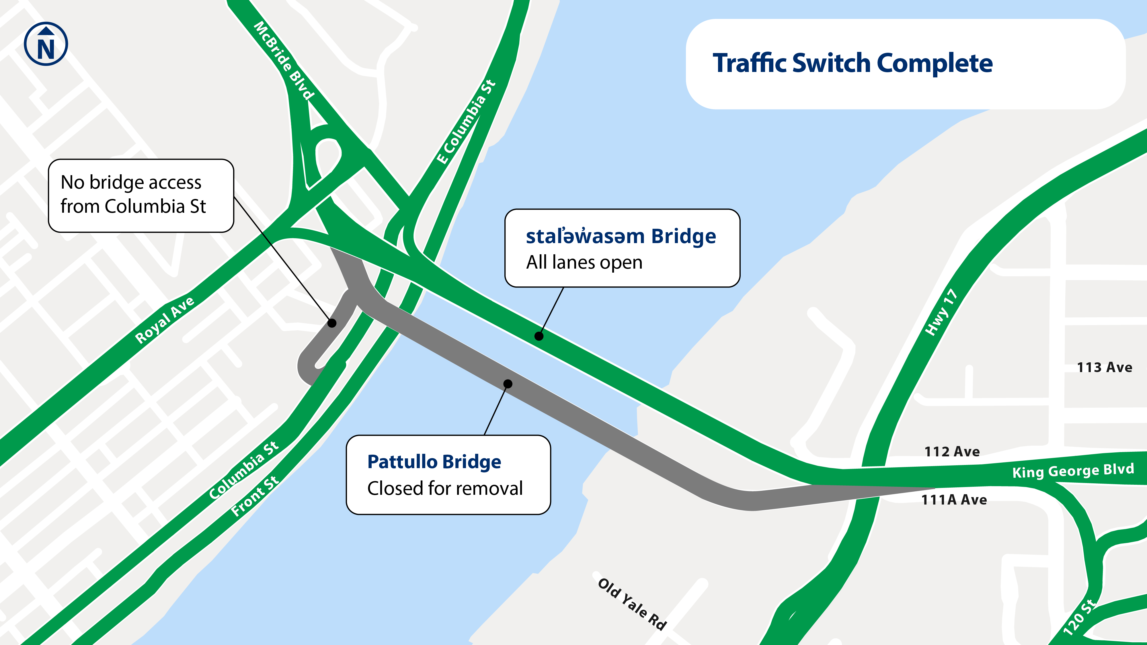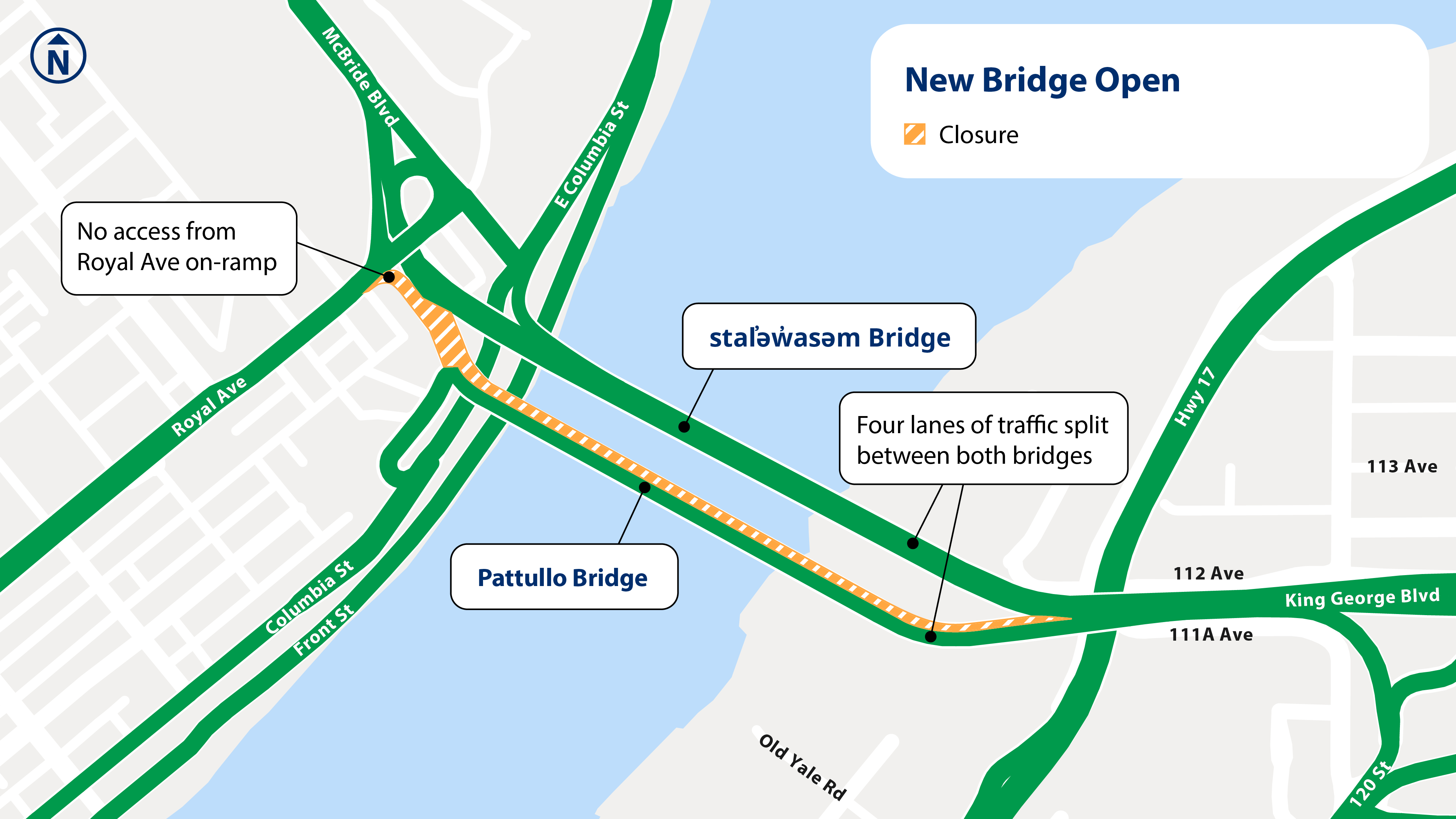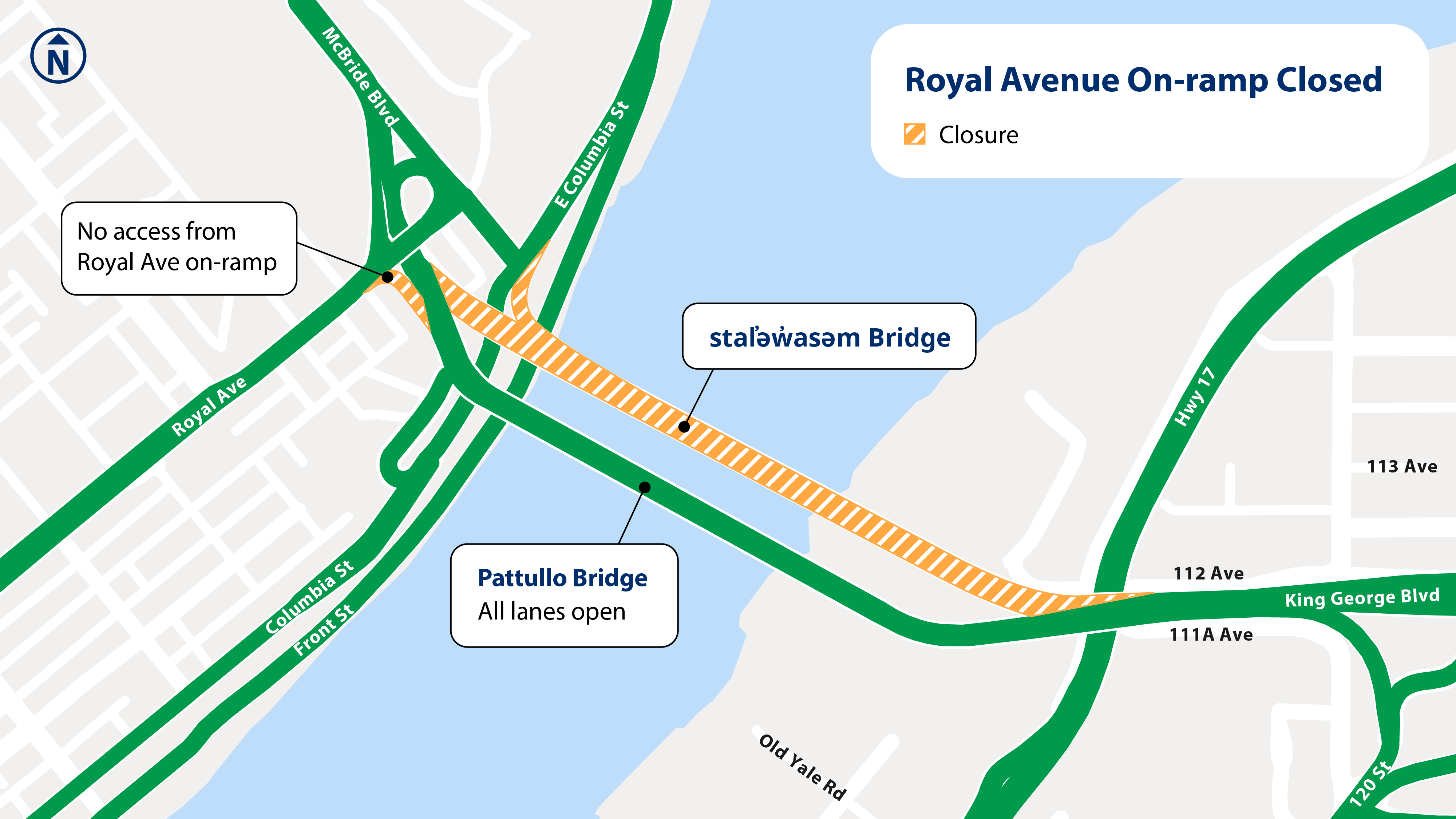 The Royal Avenue on-ramp to the Pattullo Bridge is closed for crews to remove a portion of the retaining wall alongside Bridge Connector and advance construction of the new on-ramp, connections to roadways on either side of the new bridge and the Royal-Agnes multi-use path overpass. Access to the Pattullo Bridge is available via Columbia Street loop-ramp, which is open 24/7. The new Royal Avenue on-ramp to the stal̕əw̓asəm Bridge will open in late February.