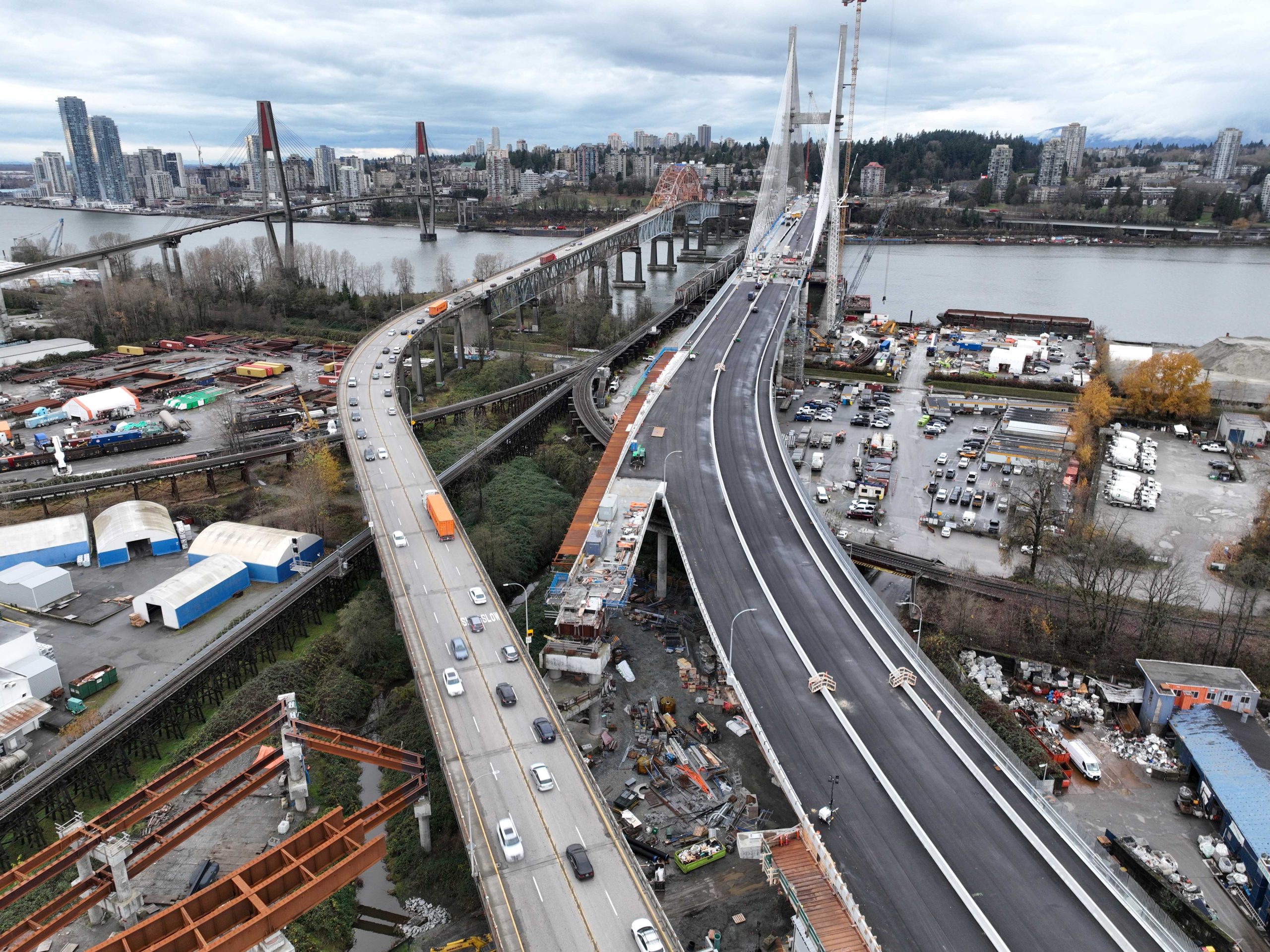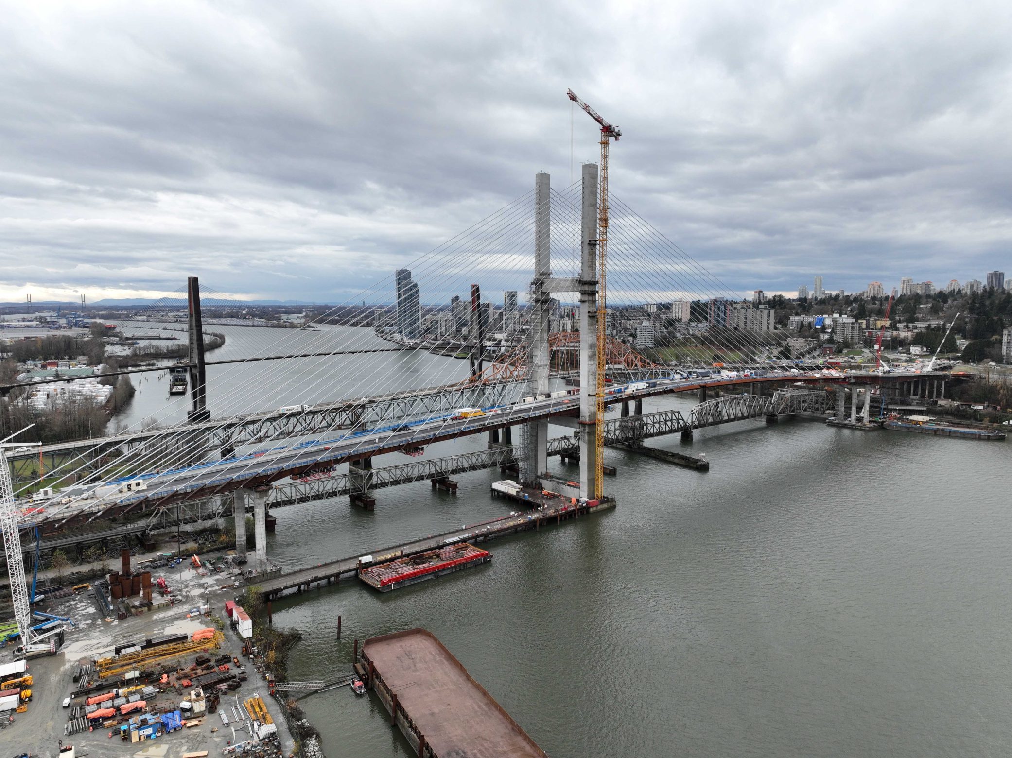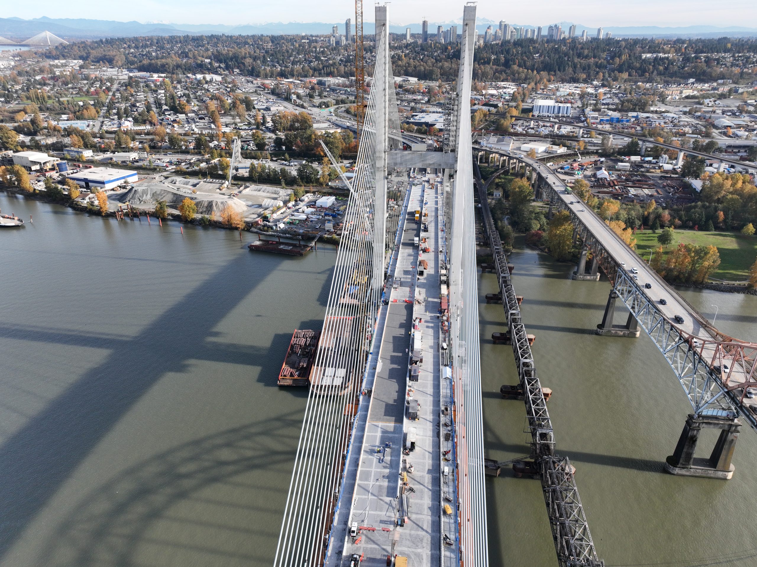 Bridge finishing works on the south approach, with the Pattullo Bridge and future Highway 17 off-ramp to the left (December 2025)Aerial view of the new bridge, with the Pattullo Bridge to the right, looking toward Surrey (December 2025)Finishing works underway on the main span bridge deck (November 2025)Cable stay progress looking south (September 2025)