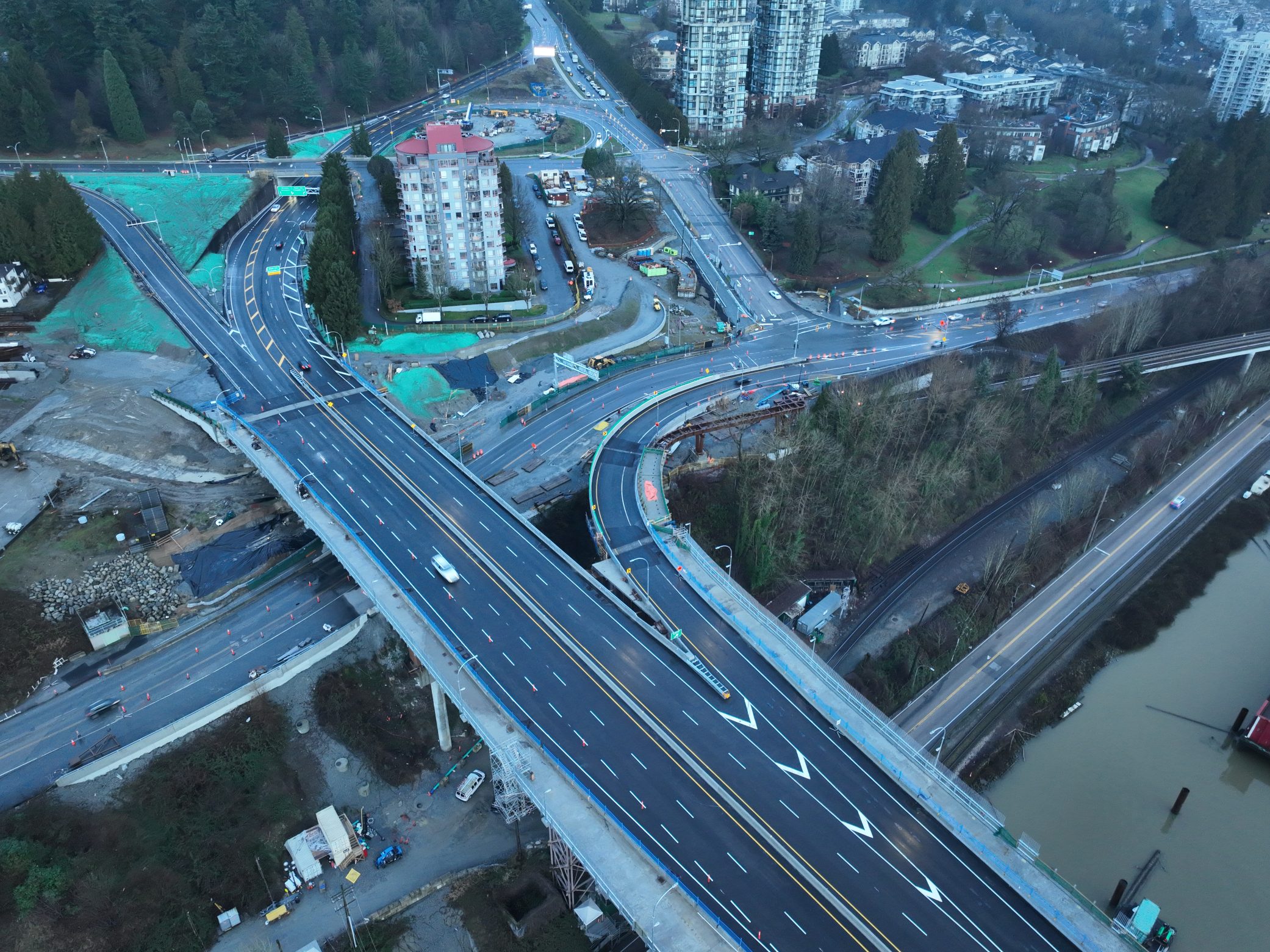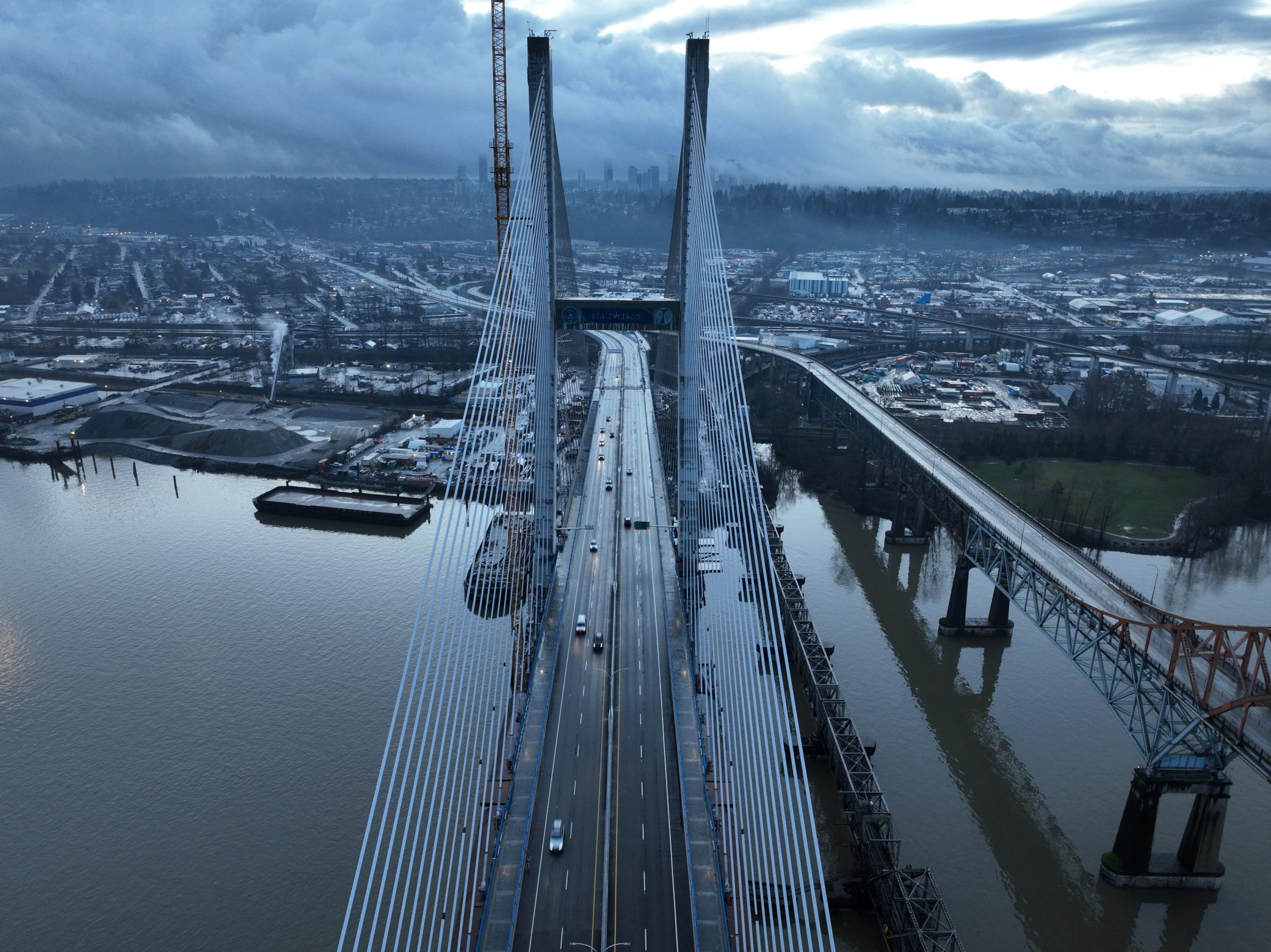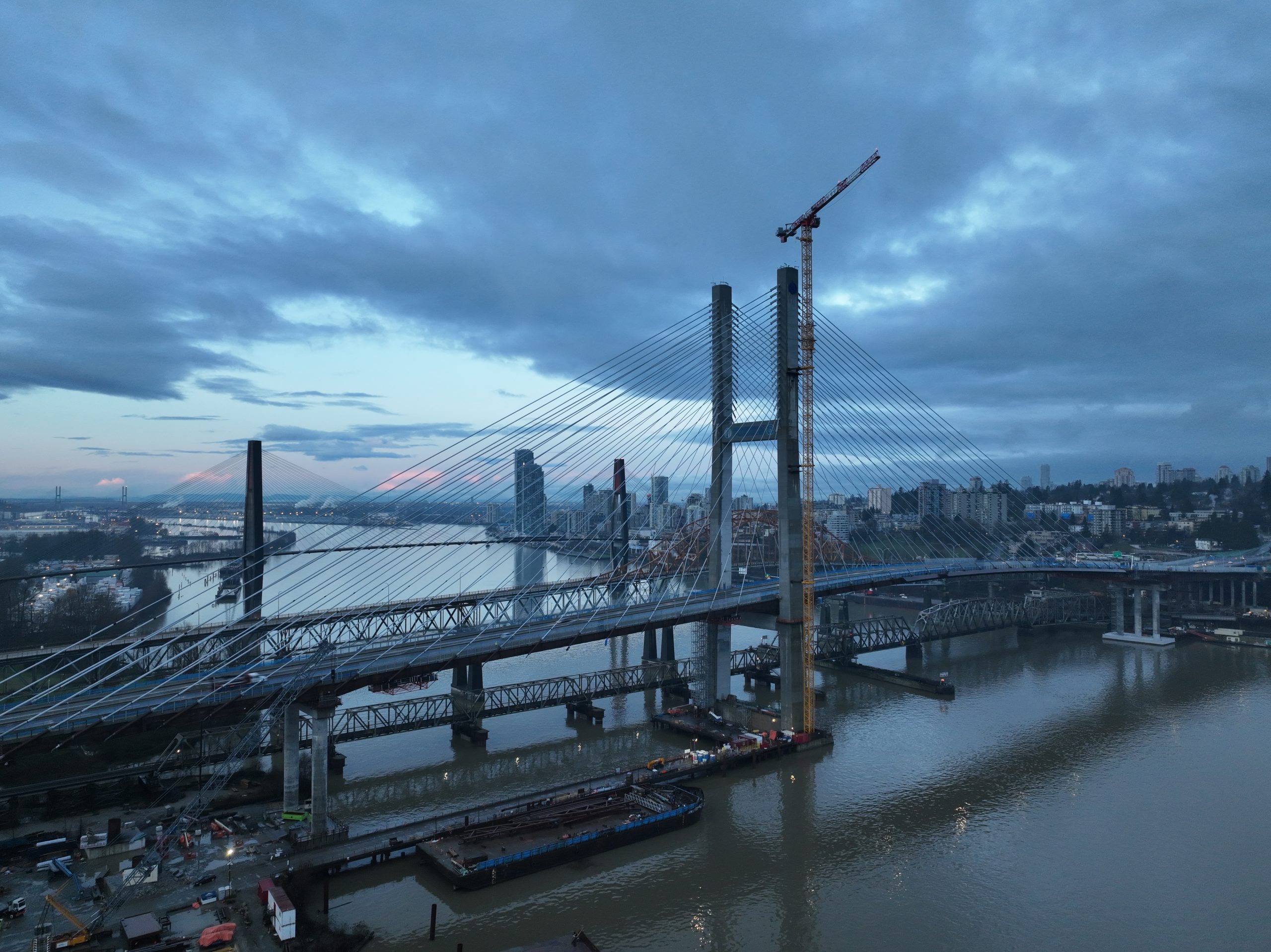 Bridge finishing works on the south approach, with the Pattullo Bridge and future Highway 17 off-ramp to the left (December 2025)Aerial view of the new bridge, with the Pattullo Bridge to the right, looking toward Surrey (December 2025)