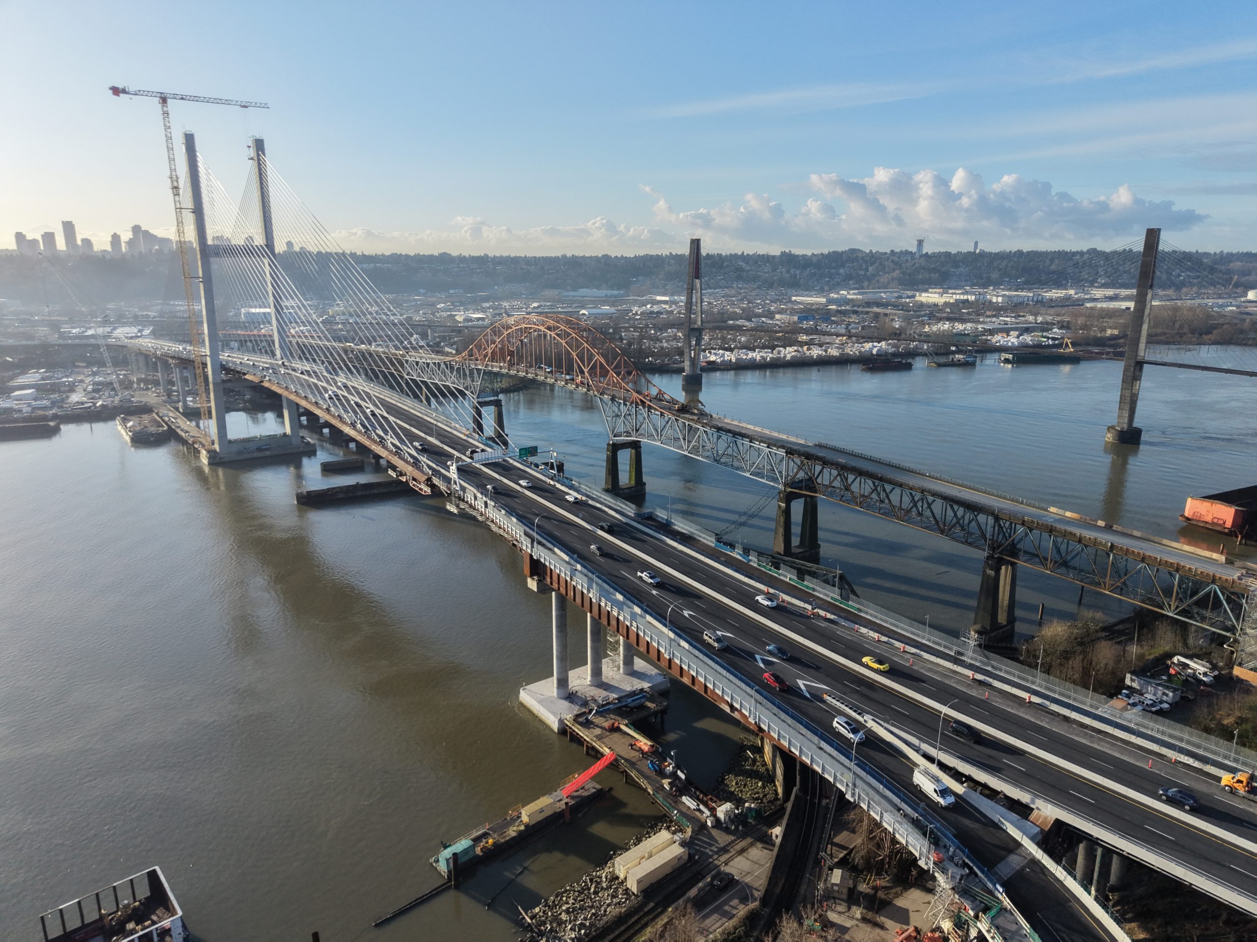 The stal̕əw̓asəm Bridge opened to four lanes of traffic on February 14, 2026Aerial view of the stal̕əw̓asəm Bridge (March 2026)Connections to the stal̕əw̓asəm Bridge in New Westminster on opening day (February 2026)Upper crossbeam artwork and nameplate (February 2026)
